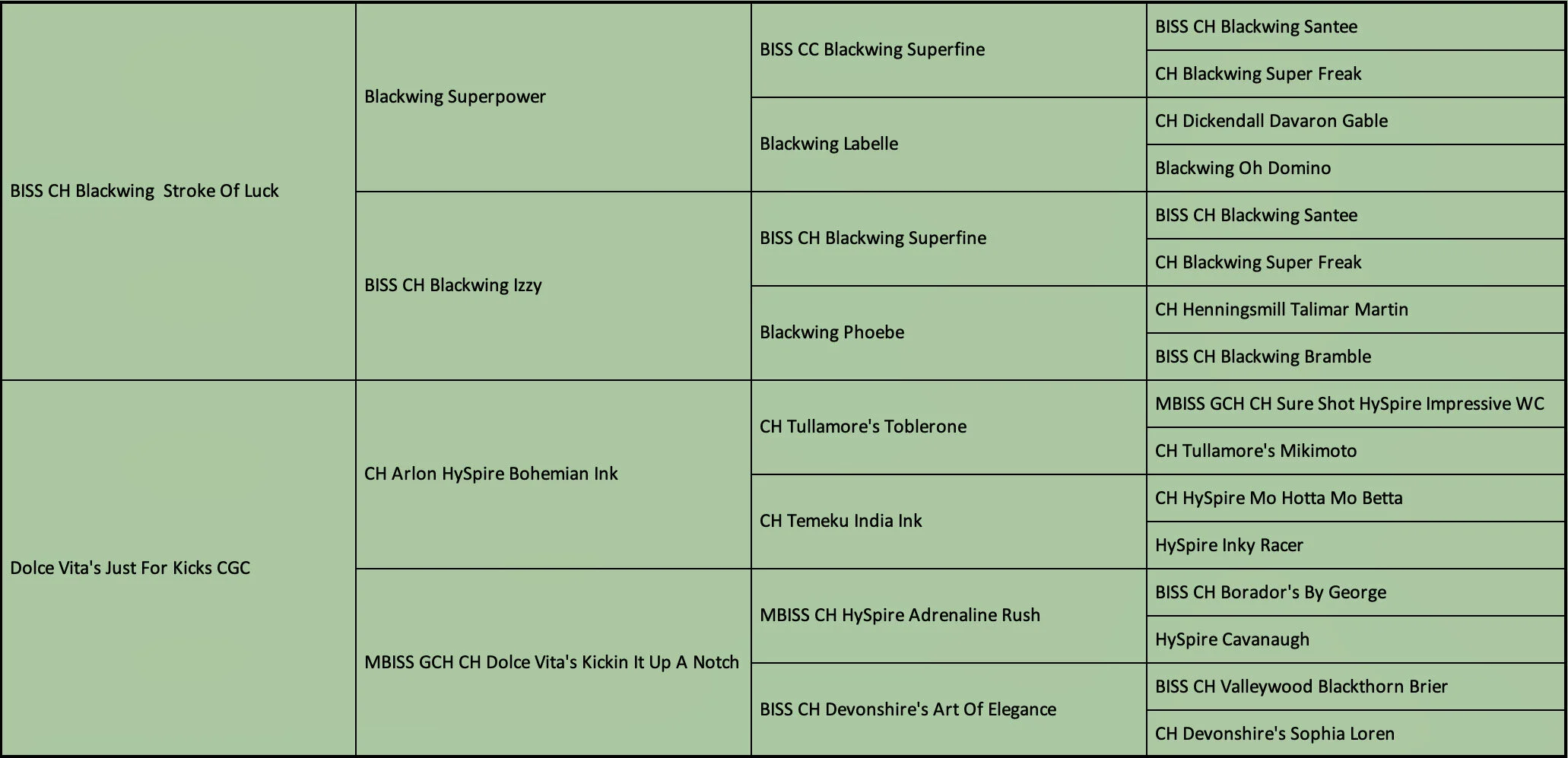 (BISS CH Blackwing Stroke of Luck x Dolce Vita’s Just For Kicks CGC)